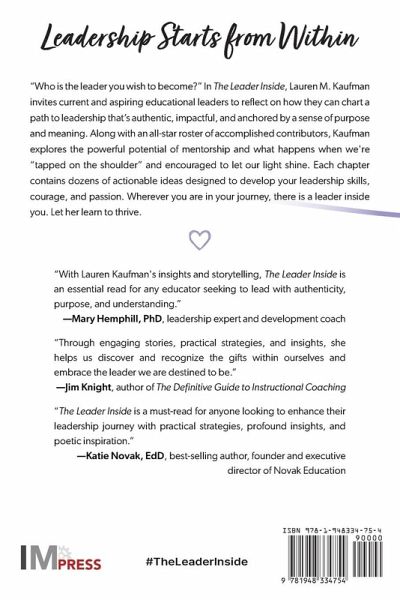 Leadership Starts from Within "Who is the leader you wish to become?" In The Leader Inside, Lauren M. Kaufman invites current and aspiring educational leaders to reflect on how they can chart a path to leadership that's authentic, impactful, and anchored by a sense of purpose and meaning. Along with an all-star roster of accomplished contributors, Kaufman explores the powerful potential of mentorship and what happens when we're "tapped on the shoulder" and encouraged to let our light shine. Each chapter contains dozens of actionable ideas designed to develop your leadership skills, courage, and passion. Wherever you are in your journey, there is a leader inside you. Let her learn to thrive. "With Lauren Kaufman's insights and storytelling, The Leader Inside is an essential read for any educator seeking to lead with authenticity, purpose, and understanding."-Mary Hemphill, PhD, leadership expert and development coach "Through engaging stories, practical strategies, and insights, she helps us discover and recognize the gifts within ourselves and embrace the leader we are destined to be." -Jim Knight, author of The Definitive Guide to Instructional Coaching "The Leader Inside is a must-read for anyone looking to enhance their leadership journey with practical strategies, profound insights, and poetic inspiration."-Katie Novak, EdD, best-selling author, founder and executive director of Novak Education #TheLeaderInside