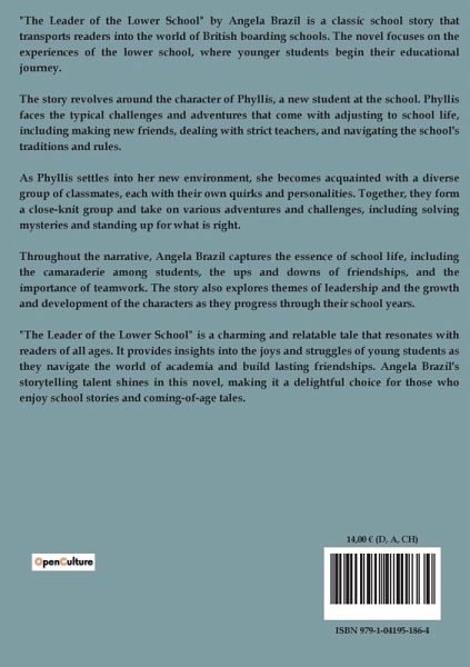 "The Leader of the Lower School" by Angela Brazil is a classic school story that transports readers into the world of British boarding schools. The novel focuses on the experiences of the lower school, where younger students begin their educational journey. The story revolves around the character of Phyllis, a new student at the school. Phyllis faces the typical challenges and adventures that come with adjusting to school life, including making new friends, dealing with strict teachers, and navigating the school's traditions and rules. As Phyllis settles into her new environment, she becomes acquainted with a diverse group of classmates, each with their own quirks and personalities. Together, they form a close-knit group and take on various adventures and challenges, including solving mysteries and standing up for what is right. Throughout the narrative, Angela Brazil captures the essence of school life, including the camaraderie among students, the ups and downs of friendships, and the importance of teamwork. The story also explores themes of leadership and the growth and development of the characters as they progress through their school years. "The Leader of the Lower School" is a charming and relatable tale that resonates with readers of all ages. It provides insights into the joys and struggles of young students as they navigate the world of academia and build lasting friendships. Angela Brazil's storytelling talent shines in this novel, making it a delightful choice for those who enjoy school stories and coming-of-age tales.