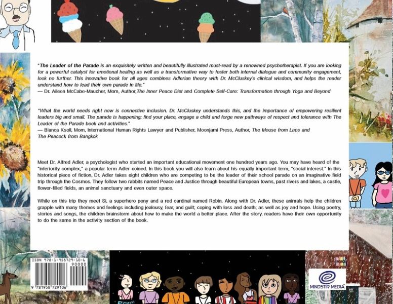 "The Leader of the Parade is an exquisitely written and beautifully illustrated must-read by a renowned psychotherapist. If you are looking for a powerful catalyst for emotional healing as well as a transformative way to foster both internal dialogue and community engagement, look no further. This innovative book for all ages combines Adlerian theory with Dr. McCluskey's clinical wisdom, and helps the reader understand how to lead their own parade in life." Dr. Aileen McCabe-Maucher, Mom, Author, The Inner Peace Diet and Complete Self-Care: Transformation Through Yoga and Beyond "What the world needs right now is connective inclusion. Dr. McCluskey understands this, and the importance of empowering resilient leaders big and small. The parade is happening; find your place, engage a child and forge new pathways of respect and tolerance with The Leader of the Parade book and activities." Bianca Ksoll, Mom, International Human Rights Lawyer Author and Publisher, Moonjami Press Meet Dr. Alfred Adler, a psychologist who started an important educational movement one hundred-years-ago. In this historical piece of fiction, Dr. Adler takes eight children who are competing to be the leader of their school parade on an imaginative field trip through the Cosmos. They follow two rabbits named Peace and Justice through beautiful European towns, past rivers and lakes, a castle, flower-filled fields, an animal sanctuary and even outer space. While on this trip they meet Si, a superhero pony and a red cardinal named Robin. Along with Dr. Adler, these animals help the children grapple with many themes and feelings including jealousy, fear, and guilt; coping with loss and death; as well as joy and hope. Using poetry, stories and songs, the children brainstorm about how to make the world a better place.
