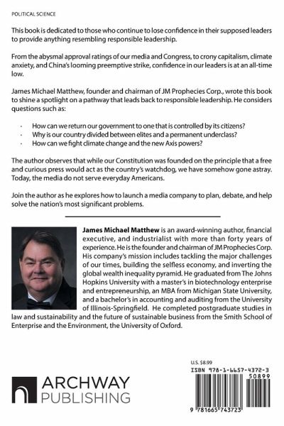 This book is dedicated to those who continue to lose confidence in their supposed leaders to provide anything resembling responsible leadership. From the abysmal approval ratings of our media and Congress, to crony capitalism, climate anxiety, and China's looming preemptive strike, confidence in our leaders is at an all-time low. James Michael Matthew, founder and chairman of JM Prophecies Corp., wrote this book to shine a spotlight on a pathway that leads back to responsible leadership. He considers questions such as: How can we return our government to one that is controlled by its citizens? Why is our country divided between elites and a permanent underclass? How can we fight climate change and the new Axis powers? The author observes that while our Constitution was founded on the principle that a free and curious press would act as the country's watchdog, we have somehow gone astray. Today, the media do not serve everyday Americans. Join the author as he explores how to launch a media company to plan, debate, and help solve the nation's most significant problems.