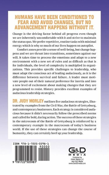 Humans have been conditioned to fear and avoid changes, but no advancement happens without it. Change is the driving factor behind all progress even though we are inherently uncomfortable with it and strive to maintain the status quo. We prefer repetitive, routine tasks with minimal energy which is why so much of our lives happen on autopilot. Comfort zones provide a sense of well-being, but change happens and we are thrust into transitions, sometimes against our will. It takes time to process the emotions and adapt to a new environment with a new set of rules and as difficult as that is for individuals, the level of complexity is multiplied in organizations. This provides specific challenges to leadership who must adapt the conscious act of leading audaciously as it is the difference between survival and failure. A leader must motivate people out of their natural preference for inertia and into a new level of excitement about making changes that they are programmed to resist. History provides excellent examples of audacious leadership strategies. Dr. Judy Morley outlines five audacious strategies, illustrated by examples from the Civil War, the Battle of Gettysburg, and contemporary businesses. Each strategy is considered audacious because it didn't necessarily follow the prescribed norms and called for bold, daring action. The success of these strategies in the microcosm of the Battle of Gettysburg is reinforced by a contemporary example in the macrocosm of today's business world. If the use of these strategies can change the course of humanity, they can certainly beef up your leadership.