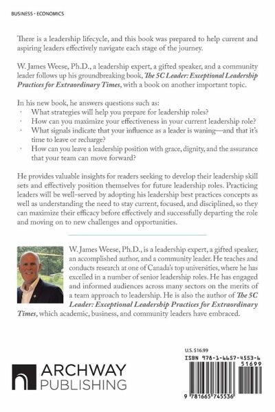 There is a leadership lifecycle, and this book was prepared to help current and aspiring leaders effectively navigate each stage of the journey. W. James Weese, Ph.D., a leadership expert, a gifted speaker, and a community leader follows up his groundbreaking book, The 5C Leader: Exceptional Leadership Practices for Extraordinary Times, with a book on another important topic. In his new book, he answers questions such as: · What strategies will help you prepare for leadership roles? · How can you maximize your effectiveness in your current leadership role? · What signals indicate that your influence as a leader is waning-and that it's time to leave or recharge? · How can you leave a leadership position with grace, dignity, and the assurance that your team can move forward? He provides valuable insights for readers seeking to develop their leadership skill sets and effectively position themselves for future leadership roles. Practicing leaders will be well-served by adopting his leadership best practices concepts as well as understanding the need to stay current, focused, and disciplined, so they can maximize their efficacy before effectively and successfully departing the role and moving on to new challenges and opportunities.