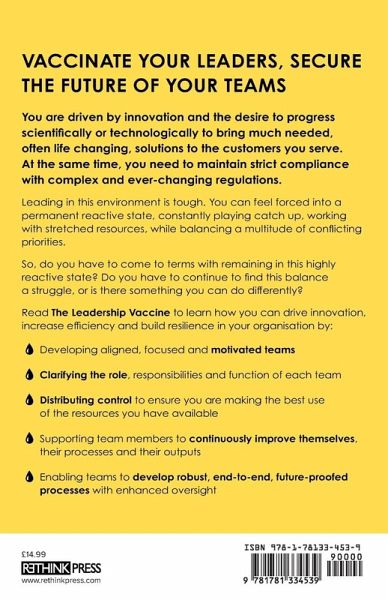 VACCINATE YOUR LEADERS, SECURE THE FUTURE OF YOUR TEAMS You are driven by innovation and the desire to progress scientifically or technologically to bring much needed, often life changing, solutions to the customers you serve. At the same time, you need to maintain strict compliance with complex and ever-changing regulations. Leading in this environment is tough. You can feel forced into a permanent reactive state, constantly playing catch up, working with stretched resources, while balancing a multitude of conflicting priorities. So, do you have to come to terms with remaining in this highly reactive state? Do you have to continue to find this balance a struggle, or is there something you can do differently? Read The Leadership Vaccine to learn how you can drive innovation, increase efficiency and build resilience in your organisation by: Developing aligned, focused and motivated teams Clarifying the role, responsibilities and function of each team Distributing control to ensure you are making the best use of the resources you have available Supporting team members to continuously improve themselves, their processes and their outputs Enabling teams to develop robust, end-to-end, future-proofed processes with enhanced oversight