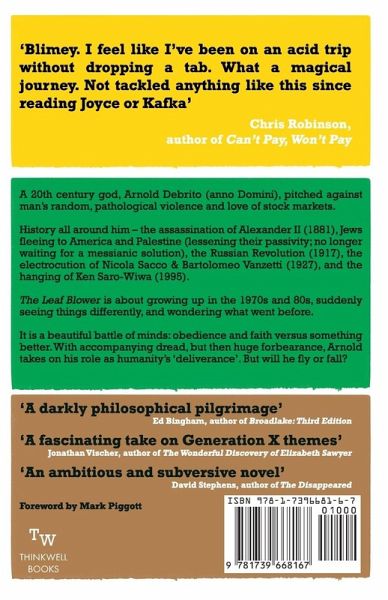 A 20th century god, Arnold Debrito (anno Domini), pitched against man's random, pathological violence and love of stock markets. History all around him - the assassination of Alexander II (1881), Jews fleeing to America and Palestine (lessening their passivity; no longer waiting for a messianic solution), the Russian Revolution (1917), the electrocution of Nicola Sacco & Bartolomeo Vanzetti (1927), and the hanging of Ken Saro-Wiwa (1995). The Leaf Blower is about growing up in the 1970s and 80s, suddenly seeing things differently, and wondering what went before. It is a beautiful battle of minds: obedience and faith versus something better. With accompanying dread, but then huge forbearance, Arnold takes on his role as humanity's 'deliverance'. But will he fly or fall?