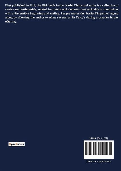 First published in 1919, the fifth book in the Scarlet Pimpernel series is a collection of stories and testimonials, related in content and character, but each able to stand alone with a discernible beginning and ending. League moves the Scarlet Pimpernel legend along by allowing the author to relate several of Sir Percy's daring escapades in one offering.