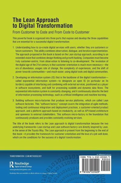 Part 1: Digital transformation: Customer orientation and homeostasis Chapter 1 Why a digital transformation? Chapter 2 Homeostasis: continuous adaptation to change Chapter 3 Lean Startup: Lean principles applied to co-creation Part II: Exponential information systems Chapter 4 The Information System as a foundation for digital transformation Chapter 5 Artificial intelligence and machine learning Chapter 6 Governance, architecture and situational potential Part III: Software platforms and service factories Chapter 7 DevOps and software factories Chapter 8 Putting platforms at the service of digital transformation Conclusion