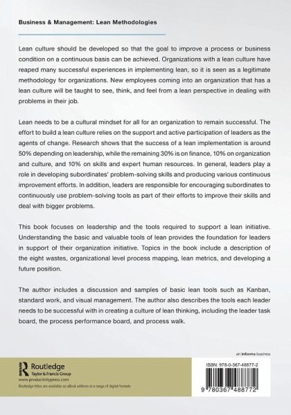 Lean culture should be developed so that the goal to improve a process or business condition on a continuous basis can be achieved. Organizations with a lean culture have reaped many successful experiences in implementing lean, so it is seen as a legitimate methodology for organizations. New employees coming into an organization that has a lean culture will be taught to see, think, and feel from a lean perspective in dealing with problems in their job. Lean needs to be a cultural mindset for all for an organization to remain successful. The effort to build a lean culture relies on the support and active participation of leaders as the agents of change. Research shows that the success of a lean implementation is around 50% depending on leadership, while the remaining 30% is on finance, 10% on organization and culture, and 10% on skills and expert human resources. In general, leaders play a role in developing subordinates, problem-solving skills, and producing various continuous improvement efforts. In addition, leaders are responsible for encouraging subordinates to continuously use problem-solving tools as part of their efforts to improve their skills and deal with bigger problems. This book focuses on leadership and the tools required to support a lean initiative. Understanding the basic and valuable tools of lean provides the foundation for leaders in support of their organization initiative. Topics in the book include a description of the eight wastes, organizational level process mapping, lean metrics, and developing a future position. The author includes a discussion and samples of basic lean tools such as Kanban, standard work, and visual management. The author also describes the tools each leader needs to be successful with in creating a culture of lean thinking, including the leader task board, the process performance board, and process walk.