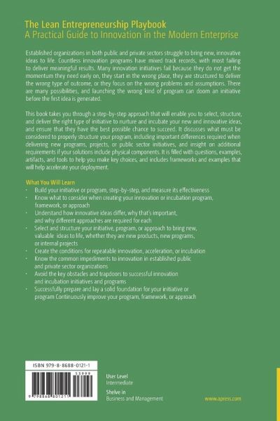 How to build your initiative or program, step-by-step, and measure its effectivenessHow innovative ideas differ, why that's important, and why they require different approachesCommon impediments to innovation and new idea incubation in public and private sector organizations and how to build an initiative that addresses themWhat to consider as you design and structure your approach to bringing new ideas to life whether they are products, programs, or internal projectsHow to lay a solid foundation for your initiative or program to ensure it meets your organization's needs and stakeholder and influencer expectationsThe teams you will need and how to structure themHow to continuously improve your program, framework, toolkit, or initiative to ensure it remains relevant delivers lasting valueWhat you should know before you begin building your initiativeThe steps required to lay a solid foundation for the initiative before you begin building itHow to create the conditions for repeatable innovation, acceleration, or new idea incubation