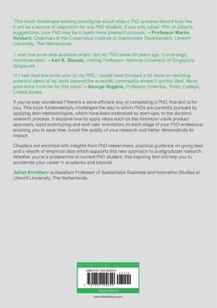 This book fundamentally challenges the way in which PhDs are currently pursued. It applies lean methodologies - which have been embraced by start-ups - to the doctoral research process. It explains how to apply techniques such as the minimal viable product (MVP) approach, rapid prototyping and pivoting to each stage, from choosing a topic to seeking feedback, in order to save time, make the process more efficient and demonstrate impact. Chapters are enriched with insights from PhD researchers, practical guidance on going lean and a wealth of empirical data which supports this new approach to postgraduate research.