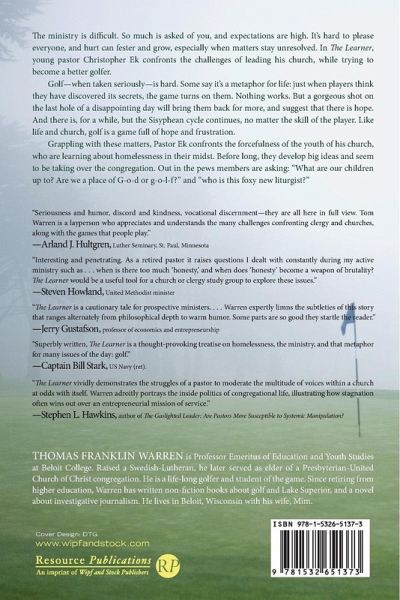 The ministry is difficult. So much is asked of you, and expectations are high. It's hard to please everyone, and hurt can fester and grow, especially when matters stay unresolved. In The Learner, young pastor Christopher Ek confronts the challenges of leading his church, while trying to become a better golfer. Golf--when taken seriously--is hard. Some say it's a metaphor for life: just when players think they have discovered its secrets, the game turns on them. Nothing works. But a gorgeous shot on the last hole of a disappointing day will bring them back for more, and suggest that there is hope. And there is, for a while, but the Sisyphean cycle continues, no matter the skill of the player. Like life and church, golf is a game full of hope and frustration. Grappling with these matters, Pastor Ek confronts the forcefulness of the youth of his church, who are learning about homelessness in their midst. Before long, they develop big ideas and seem to be taking over the congregation. Out in the pews members are asking: ""What are our children up to? Are we a place of G-o-d or g-o-l-f?"" and ""who is this foxy new liturgist?""