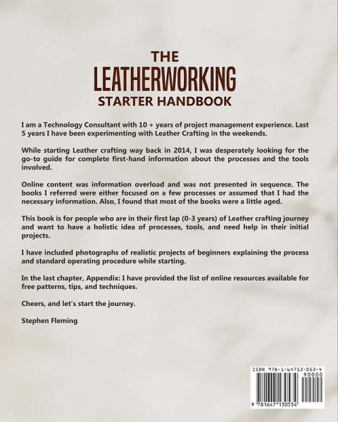 Suppose, you have to appear for an exam next week, who would be the go-to person for seeking help and guidance? Option 1: A Subject Matter Expert (SME) who studying/teaching the subject for several years and often assumes while explaining that the basics are covered or looks it from their frame of reference. Or Option 2: Someone who also started from scratch as you have and passed the exam just last week. He/She knows the exact process, challenges, doubts, and roadblocks you may be facing and can think from your perspective. If your option is 2, you are in the right place. I am a Technology Consultant by profession, and started my leathercraft journey in the year 2014. I started by going through multiple YouTube videos, courses, Facebook groups, and finally completed my first project after four months. I was confused and was lost in the magnitude of information available online. I firmly believe that while starting, you need exact, necessary, minimalistic information to start your first project, pardon: Complete your first project! So I started writing this book to provide a minimalistic approach to information required to start your first leather project. It covers: - History of leather - Basics Tools and their usage - Making Patterns - Cutting Patterns - Gluing - Beveling, Embossing, Stamping - Stitching basics - Coloring and Finishing - Tips, Techniques for the beginner - Appendix: List of online resources available for free patterns, tips, and techniques. I still remember the initial doubts I had and the tips which helped me. This book is for people who are in their first lap (0-3 years) of Leather crafting journey and want to have a holistic idea of processes, tools, and need help in their initial projects. I have included photographs of realistic projects of beginners explaining the process and standard operating procedure while starting. So, what are you waiting for? Get this updated book and start your Leather Crafting Journey Today!
