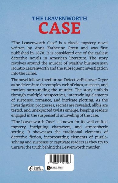 ""The Leavenworth Case"" is a classic mystery novel written by Anna Katherine Green and was first published in 1878. It is considered one of the earliest detective novels in American literature. The story revolves around the murder of wealthy businessman Horatio Leavenworth and the subsequent investigation into the crime. The novel follows the efforts of Detective Ebenezer Gryce as he delves into the complex web of clues, suspects, and motives surrounding the murder. The story unfolds through multiple perspectives, intertwining elements of suspense, romance, and intricate plotting. As the investigation progresses, secrets are revealed, alibis are tested, and unexpected twists emerge, keeping readers engaged in the suspenseful unraveling of the case. ""The Leavenworth Case"" is known for its well-crafted mystery, intriguing characters, and atmospheric setting. It showcases the traditional elements of detective fiction, incorporating elements of puzzle-solving and suspense to captivate readers as they try to unravel the truth behind the Leavenworth murder.