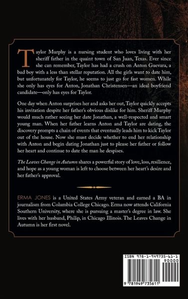 Taylor Murphy is a nursing student who loves living with her sheriff father in the quaint town of San Juan, Texas. Ever since she can remember, Taylor has had a crush on Anton Guevara, a bad boy with a less than stellar reputation. All the girls want to date him, but unfortunately for Taylor, he seems to just go for fast women. While she only has eyes for Anton, Jonathan Christensen an ideal boyfriend candidate only has eyes for Taylor. One day when Anton surprises her and asks her out, Taylor quickly accepts his invitation despite her father’s obvious dislike for him. Sheriff Murphy would much rather seeing her date Jonathan, a well-respected and smart young man. When her father learns Anton and Taylor are dating, the discovery prompts a chain of events that eventually leads him to kick Taylor out of the house. Now she must decide whether to end her relationship with Anton and begin dating Jonathan just to please her father or follow her heart and continue to date the man he despises. The Leaves Change in Autumn shares a powerful story of love, loss, resilience, and hope as a young woman is left to choose between her heart’s desire and her father’s approval.