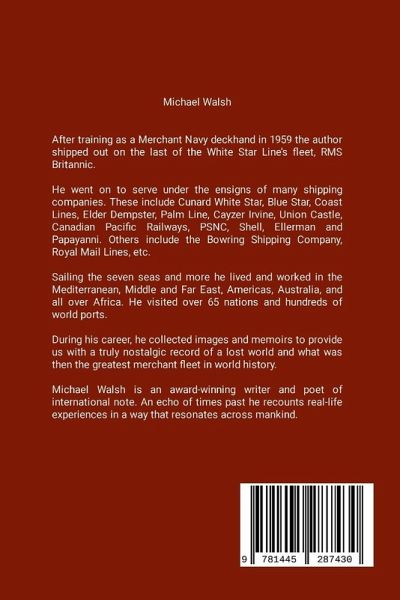 After training as a Merchant Navy deckhand in 1959 the author Michael Walsh shipped out on the last of the White Star Line's fleet, RMS Britannic. He went on to serve under the ensigns of many shipping companies. These include Cunard White Star, Blue Star, Coast Lines, Elder Dempster, Palm Line, Cayzer Irvine, Union Castle, Canadian Pacific Railways, PSNC, Shell, Ellerman and Papayanni. Others include the Bowring Shipping Company, Royal Mail Lines, etc. Sailing the seven seas and more he lived and worked in the Mediterranean, Middle and Far East, Americas, Australia, and all over Africa. He visited over 65 nations and hundreds of world ports. During his career, he collected images and memoirs to provide us with a truly nostalgic record of a lost world and what was then the greatest merchant fleet in world history. Michael Walsh is an award-winning writer and poet of international note. An echo of times past he recounts real-life experiences in a way that resonates across mankind.