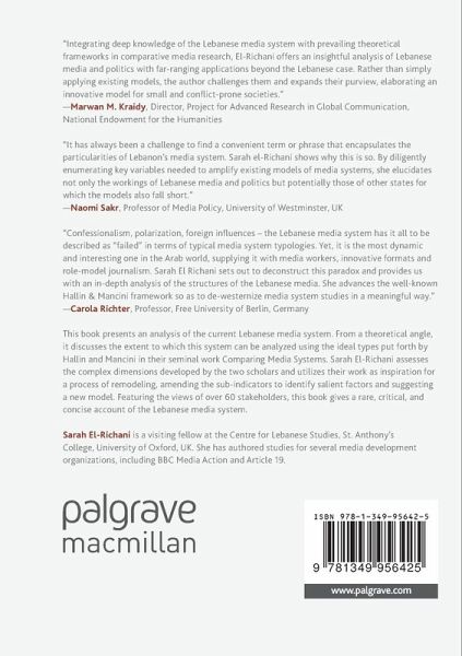 This book presents an analysis of the current Lebanese media system. From a theoretical angle, it discusses the extent to which this system can be analyzed using the ideal types put forth by Hallin and Mancini in their seminal work Comparing Media Systems. Sarah El-Richani assesses the complex dimensions developed by the two scholars and utilizes their work as inspiration for a process of remodeling, amending the sub-indicators to identify salient factors and suggesting a new model. Featuring the views of over 60 stakeholders, this book gives a rare, critical, and concise account of the Lebanese media system.