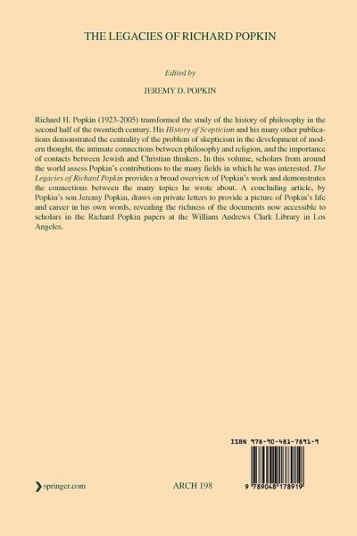 Richard H. Popkin (1923-2005) transformed the study of the history of philosophy in the second half of the twentieth century. His History of Scepticism and his many other publications demonstrated the centrality of the problem of skepticism in the development of modern thought, the intimate connections between philosophy and religion, and the importance of contacts between Jewish and Christian thinkers. In this volume, scholars from around the world assess Popkin's contributions to the many fields in which he was interested. The Legacies of Richard Popkin provides a broad overview of Popkin's work and demonstrates the connections between the many topics he wrote about. A concluding article, by Popkin's son Jeremy Popkin, draws on private letters to provide a picture of Popkin's life and career in his own words, revealing the richness of the documents now accessible to scholars in the Richard Popkin papers at the William Andrews Clark Library in Los Angeles.
