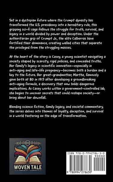 The Legacy Series is a bold and thought-provoking sci-fi saga set in a fractured future where power is inherited, truth is dangerous, and rebellion is born from bloodlines. Spanning generations, the series explores the tangled legacy of scientific discovery and authoritarian rule in a United States reshaped by the Crumpt dynasty and ruled by the elite Calaberras. Walled cities protect the privileged while the rest of society struggles to survive under rigid control. In Book 1: Casey's Journey, young scientist Casey uncovers buried truths hidden in her family's pioneering work on anti-aging and late-life conception. As she digs into her great-grandmother Martha's research and confronts the shadows in her father's lab, she begins to unravel the lies that prop up a crumbling regime-and discovers the dangerous role her bloodline might play in reshaping the future. In Book 2: The Rise of Ruth, the focus shifts to Ruth Rossiter, a girl born of science and raised on rebellion. As Ruth learns the truth about her extraordinary origins, she is pulled between a legacy of justice and a heritage of privilege. With her family's secrets as both weapon and warning, Ruth must carve her own path in a society where knowledge is power-and power is merciless. Her journey from hidden child to resistance leader will ignite a movement that could change everything.