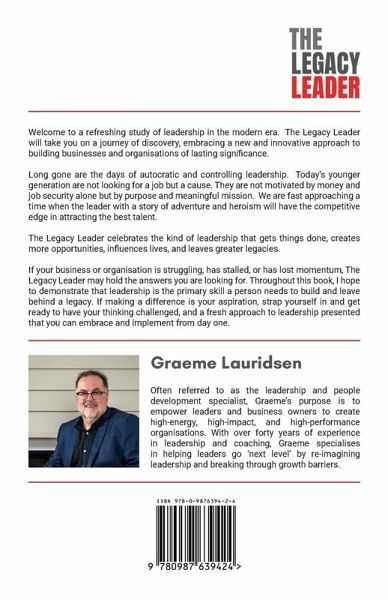 Welcome to a refreshing study of leadership in the modern era. The Legacy Leader will take you on a journey of discovery, embracing a new and innovative approach to building businesses and organisations of lasting significance. Long gone are the days of autocratic and controlling leadership. Today's younger generation are not looking for a job but a cause. They are not motivated by money and job security alone but by purpose and meaningful mission. We are fast approaching a time when the leader with a story of adventure and heroism will have the competitive edge in attracting the best talent. The Legacy Leader celebrates the kind of leadership that gets things done, creates more opportunities, influences lives, and leaves greater legacies. If your business or organisation is struggling, has stalled, or has lost momentum, The Legacy Leader may hold the answers you are looking for. Throughout this book, I hope to demonstrate that leadership is the primary skill a person needs to build and leave behind a legacy. If making a difference is your aspiration, strap yourself in and get ready to have your thinking challenged, and a fresh approach to leadership presented that you can embrace and implement from day one.