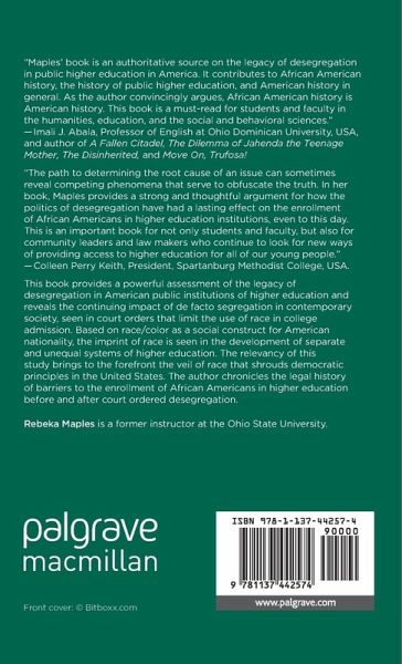 "The path to determining the root cause of an issue can sometimes reveal competing phenomena that serve to obfuscate the truth. In her book, Maples provides a strong and thoughtful argument for how the politics of desegregation have had a lasting effect on the enrollment of African Americans in higher education institutions, even to this day. This is an important book for not only students and faculty to read, but also for community leaders and law makers who continue to look for new ways of providing access to higher education for all of our young people." - Colleen Perry Keith, President, Spartanburg Methodist College, USA