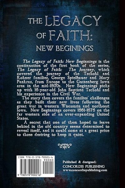 The Legacy of Faith: New Beginnings is the continuation of the first book of the series, The Legacy of Faith: The Journey, which covered the journey of the Tschohl and Rohner families, George Spielbauer and Mary Pankraz, from Europe to the Guttenberg Iowa area in the mid-1800s. New Beginnings picks up with 16-year-old John Baptiste Tschohl and his experience in the Civil War. The story then covers the families' challenges as they built their new lives following the great war in western Wisconsin and northeast Iowa. New Beginnings covers 1861-1876 on the far western side of an ever-expanding United States. A secret that one of them hoped to leave behind in the old country seems determined to reveal itself, and it could come at a great price to those desiring to keep it quiet.