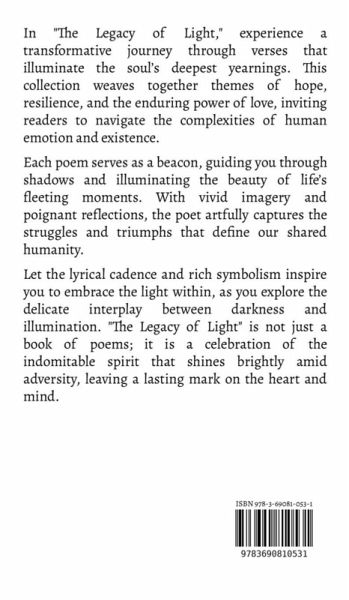 In "The Legacy of Light," experience a transformative journey through verses that illuminate the soul's deepest yearnings. This collection weaves together themes of hope, resilience, and the enduring power of love, inviting readers to navigate the complexities of human emotion and existence. Each poem serves as a beacon, guiding you through shadows and illuminating the beauty of life's fleeting moments. With vivid imagery and poignant reflections, the poet artfully captures the struggles and triumphs that define our shared humanity. Let the lyrical cadence and rich symbolism inspire you to embrace the light within, as you explore the delicate interplay between darkness and illumination. "The Legacy of Light" is not just a book of poems; it is a celebration of the indomitable spirit that shines brightly amid adversity, leaving a lasting mark on the heart and mind.