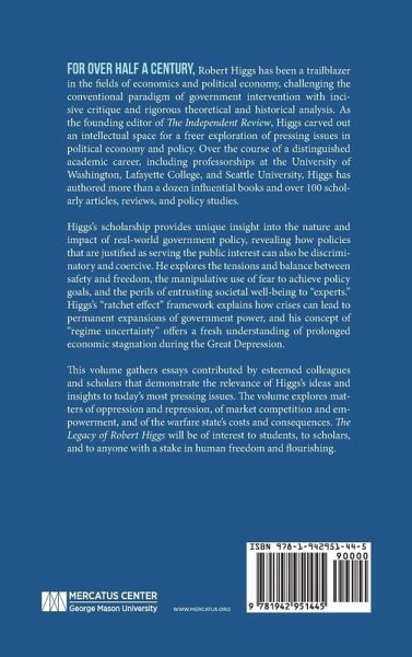 For over half a century, Robert Higgs has been a trailblazer in the fields of economics and political economy, challenging the conventional paradigm of government intervention with incisive critique and rigorous theoretical and historical analysis. As the founding editor of The Independent Review, Higgs carved out an intellectual space for a freer exploration of pressing issues in political economy and policy. Over the course of a distinguished academic career, including professorships at the University of Washington, Lafayette College, and Seattle University, Higgs has authored more than a dozen influential books and over 100 scholarly articles, reviews, and policy studies. Higgs's scholarship provides unique insight into the nature and impact of real-world government policy, revealing how policies that are justified as serving the public interest can also be discriminatory and coercive. He explores the tensions and balance between safety and freedom, the manipulative use of fear to achieve policy goals, and the perils of entrusting societal well-being to "experts." Higgs's "ratchet effect" framework explains how crises can lead to permanent expansions of government power, and his concept of "regime uncertainty" offers a fresh understanding of prolonged economic stagnation during the Great Depression. This volume gathers essays contributed by esteemed colleagues and scholars that demonstrate the relevance of Higgs's ideas and insights to today's most pressing issues. The volume explores matters of oppression and repression, of market competition and empowerment, and of the warfare state's costs and consequences. The Legacy of Robert Higgs will be of interest to students, to scholars, and to anyone with a stake in human freedom and flourishing.