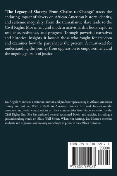 "The Legacy of Slavery: From Chains to Change" traces the enduring impact of slavery on African American history, identity, and systemic inequality. From the transatlantic slave trade to the Civil Rights Movement and modern activism, this book explores resilience, resistance, and progress. Through powerful narratives and historical insights, it honors those who fought for freedom and examines how the past shapes the present. A must-read for understanding the journey from oppression to empowerment and the ongoing pursuit of justice.