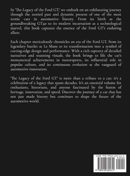 In 'The Legacy of the Ford GT,' we embark on an exhilarating journey through the storied past and dynamic present of one of the most iconic cars in automotive history. From its birth as the groundbreaking GT40 to its modern incarnation as a technological marvel, this book captures the essence of the Ford GT's enduring allure. Each chapter meticulously chronicles an era of the Ford GT, from its legendary battles at Le Mans to its transformation into a symbol of cutting-edge design and performance. With a rich tapestry of detailed narratives and stunning visuals, the book brings to life the car's monumental achievements in motorsports, its influential role in popular culture, and its continuous evolution at the vanguard of automotive innovation. 'The Legacy of the Ford GT' is more than a tribute to a car; it's a celebration of a legacy that spans decades. It's an essential volume for enthusiasts, historians, and anyone fascinated by the fusion of heritage, innovation, and speed. Discover the journey of a car that has not just made history but continues to shape the future of the automotive world.