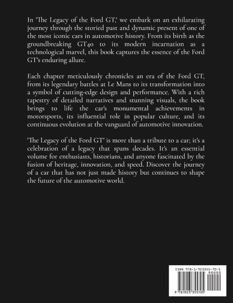 In 'The Legacy of the Ford GT,' we embark on an exhilarating journey through the storied past and dynamic present of one of the most iconic cars in automotive history. From its birth as the groundbreaking GT40 to its modern incarnation as a technological marvel, this book captures the essence of the Ford GT's enduring allure. Each chapter meticulously chronicles an era of the Ford GT, from its legendary battles at Le Mans to its transformation into a symbol of cutting-edge design and performance. With a rich tapestry of detailed narratives and stunning visuals, the book brings to life the car's monumental achievements in motorsports, its influential role in popular culture, and its continuous evolution at the vanguard of automotive innovation. 'The Legacy of the Ford GT' is more than a tribute to a car; it's a celebration of a legacy that spans decades. It's an essential volume for enthusiasts, historians, and anyone fascinated by the fusion of heritage, innovation, and speed. Discover the journey of a car that has not just made history but continues to shape the future of the automotive world.
