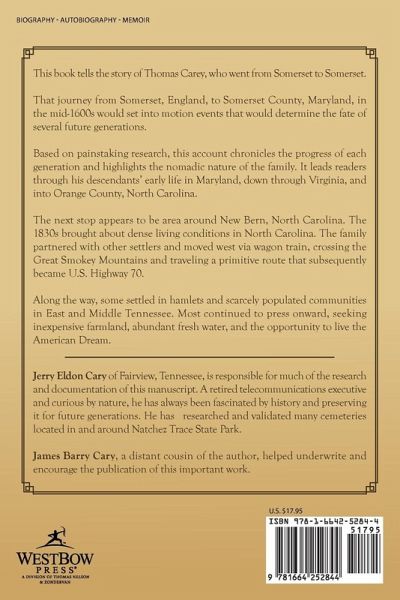 This book tells the story of Thomas Carey, who went from Somerset to Somerset. That journey from Somerset, England, to Somerset County, Maryland, in the mid-1600s would set into motion events that would determine the fate of several future generations. Based on painstaking research, this account chronicles the progress of each generation and highlights the nomadic nature of the family. It leads readers through his descendants' early life in Maryland, down through Virginia, and into Orange County, North Carolina. The next stop appears to be area around New Bern, North Carolina. The 1830s brought about dense living conditions in North Carolina. The family partnered with other settlers and moved west via wagon train, crossing the Great Smokey Mountains and traveling a primitive route that subsequently became U.S. Highway 70. Along the way, some settled in hamlets and scarcely populated communities in East and Middle Tennessee. Most continued to press onward, seeking inexpensive farmland, abundant fresh water, and the opportunity to live the American Dream.