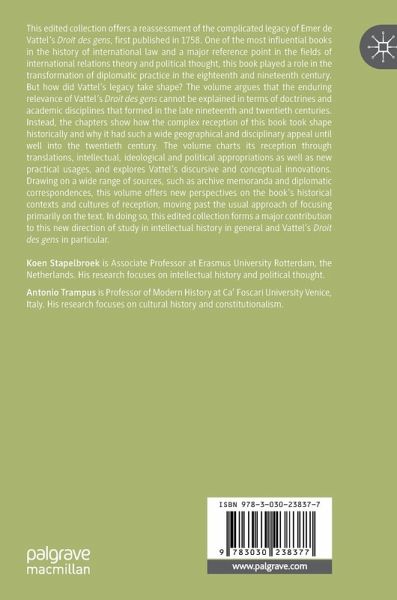 This edited collection offers a reassessment of the complicated legacy of Emer de Vattel's Droit des gens, first published in 1758. One of the most influential books in the history of international law and a major reference point in the fields of international relations theory and political thought, this book played a role in the transformation of diplomatic practice in the eighteenth and nineteenth century. But how did Vattel's legacy take shape? The volume argues that the enduring relevance of Vattel's Droit des gens cannot be explained in terms of doctrines and academic disciplines that formed in the late nineteenth and twentieth centuries. Instead, the chapters show how the complex reception of this book took shape historically and why it had such a wide geographical and disciplinary appeal until well into the twentieth century. The volume charts its reception through translations, intellectual, ideological and political appropriations as well as new practical usages, and explores Vattel's discursive and conceptual innovations. Drawing on a wide range of sources, such as archive memoranda and diplomatic correspondences, this volume offers new perspectives on the book's historical contexts and cultures of reception, moving past the usual approach of focusing primarily on the text. In doing so, this edited collection forms a major contribution to this new direction of study in intellectual history in general and Vattel's Droit des gens in particular.