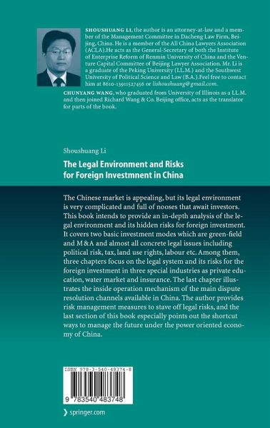 The Chinese market is appealing, but its legal environment is very complicated and full of nooses that await investors. This book intends to provide an in-depth analysis of the legal environment and its hidden risks for foreign investment. It covers two basic investment modes which are green-field and M and A, and almost all concrete legal issues including political risk, tax, land use rights, labor etc. Among them, three chapters focus on the legal system and its risks for the foreign investment in three special industries as private education, water market and insurance. The detailed analysis is based on the newest laws and regulations.
