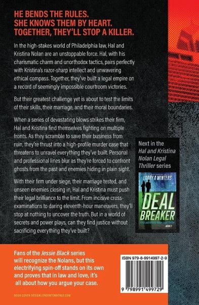He bends the rules. She knows them by heart. Together, they'll stop a killer. In the high-stakes world of Philadelphia law, Hal and Kristina Nolan are an unstoppable force. Hal, with his charismatic charm and unorthodox tactics, pairs perfectly with Kristina's razor-sharp intellect and unwavering ethical compass. Together, they've built a legal empire on a record of seemingly impossible courtroom victories. But their greatest challenge yet is about to test the limits of their skills, their marriage, and their moral boundaries. When a series of devastating blows strikes their firm, Hal and Kristina find themselves fighting on multiple fronts. As they scramble to save their business from ruin, they're thrust into a high-profile murder case that threatens to unravel everything they've built. Personal and professional lines blur as they're forced to confront ghosts from the past and enemies hiding in plain sight. With their firm under siege, their marriage tested, and unseen enemies closing in, Hal and Kristina must push their legal brilliance to the limit. From incisive cross-examinations to daring eleventh-hour maneuvers, they'll stop at nothing to uncover the truth. But in a world of secrets and power plays, can they find justice without sacrificing everything they've built? Fans of the Jessie Black series will recognize the Nolans, but this electrifying spin-off stands on its own and proves that in law and love, it's all about how you argue your case.