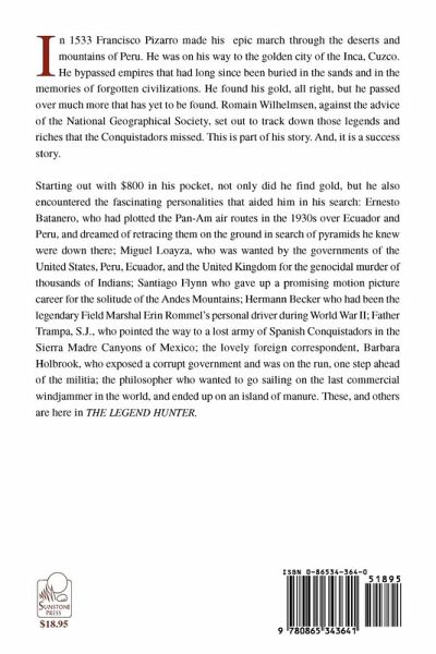 In 1533 Francisco Pizarro made his epic march through the deserts and mountains of Peru. He was on his way to the golden city of the Inca, Cuzco. He bypassed empires that had long since been buried in the sands and in the memories of forgotten civilizations. He found his gold, all right, but he passed over much more that has yet to be found. Romain Wilhelmsen, against the advice of the National Geographical Society, set out to track down those legends and riches that the Conquistadors missed. This is part of his story. And, it is a success story. Starting out with $800 in his pocket, not only did he find gold, but he also encountered the fascinating personalities that aided him in his search: Ernesto Batanero, who had plotted the Pan-Am air routes in the 1930s over Ecuador and Peru, and dreamed of retracing them on the ground in search of pyramids he knew were down there; Miguel Loayza, who was wanted by the governments of the United States, Peru, Ecuador, and the United Kingdom for the genocidal murder of thousands of Indians; Santiago Flynn who gave up a promising motion picture career for the solitude of the Andes Mountains; Hermann Becker who had been the legendary Field Marshal Erin Rommel's personal driver during World War II; Father Trampa, S.J., who pointed the way to a lost army of Spanish Conquistadors in the Sierra Madre Canyons of Mexico; the lovely foreign correspondent, Barbara Holbrook, who exposed a corrupt government and was on the run, one step ahead of the militia; the philosopher who wanted to go sailing on the last commercial windjammer in the world, and ended up on an island of manure. These, and others are here in THE LEGEND HUNTER.