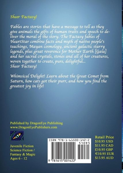 Fables are stories that have a message to tell as they give animals the gifts of human traits and speech to deliver the moral of the story. The Factasy fable of HeartStar combine facts and myths of native people's teachings, Mayan cosmology, ancient galactic starry legends, plus great reverence for Mother Earth [Gaia] and her sacred crystals, stones and all of her creatures, woven together to create, pure, delightful… Sheer Factasy! Whimsical Delight! Learn about the Great Comet from Saturn, how cats got their purr, and how you find the greatest joy in life! About these 3 Fantasy Fables in the book. Fable One - The Legend of AngelGreen This is the original collection of three stories to delight all, with adventures of The Master Wizard, the Fairy Princess, and how the entire galaxy was saved by the most powerful force in all the cosmos. Fable Two - The Hand of the StarMaker Learn how Earth came to be populated, and all about our mission on this planet. Learn what a W.P.V. is, and it's vital role! Coming soon to galaxy near you!! Fable Three - The Wizard Forest of Etznab Sheer Whimsical Fantasy… A Delight!! Discover the Great Shining Star of Joy from Saturn, learn how cats got their purr, how trees have an angelic connection…and how you… find the… greatest joy in life!