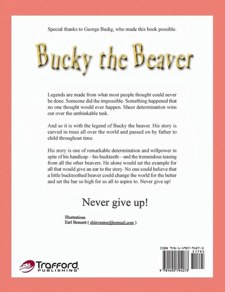 Legends are made from what most people thought could never be done. Someone did the impossible. Something happened that no one thought would ever happen. Sheer determination wins out over the unthinkable task. And so it is with the legend of Bucky the beaver. His story is carved in trees all over the world and passed on by father to child throughout time. His story is one of remarkable determination and willpower in spite of his handicap-his buckteeth-and the tremendous teasing from all the other beavers. He alone would set the example for all that would give an ear to the story. No one could believe that a little bucktoothed beaver could change the world for the better and set the bar so high for us all to aspire to. Never give up!