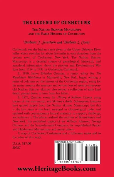 Cushetunk was the Indian name given to the Upper Delaware River valley which stretches for about five miles in each direction from the present town of Cochecton, New York. The Nathan Skinner Manuscript is a detailed source of genealogical, historical, and anecdotal information about the pioneer and Revolutionary War days from 1754 to 1783 in Cochecton/Cushetunk. In 1850, James Eldridge Quinlan, a junior editor for The Republican Watchman in Monticello, New York, began writing a series of columns on the history of the Cochecton region, using for his main resource the memory and written lore of seventy-three-year-old Nathan Skinner. Skinner also owned a collection of early land deeds, passed down to him from his father. In 1873, Quinlan wrote his History of Sullivan County, using copies of the manuscript and Skinner's deeds. Subsequent histories have quoted largely from the Nathan Skinner Manuscript, but this is the first time it has been arranged in chronological order and updated with contemporary factual materials to support, challenge, and enhance it. The editors utilized the archives of Pennsylvania and New York, the published papers of Sir William Johnson, George Clinton, and the Susquehannah Company, the unpublished Draper and Haldimand Manuscripts and many others. A map of Cochecton/Cushetunk and a full-name index add to the value of this work.