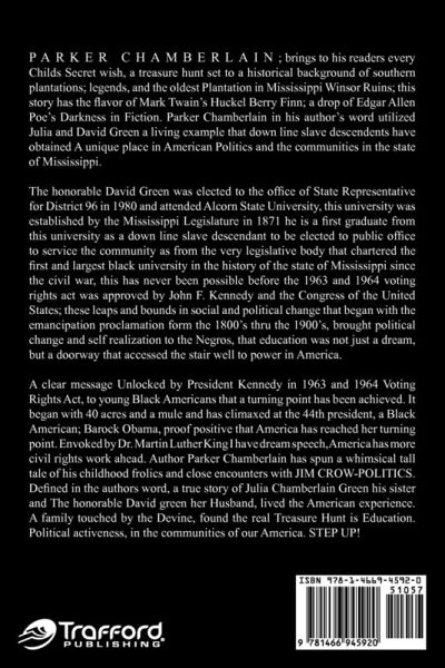 Parker Chamberlain; brings to his readers every Childs Secret wish, a treasure hunt set to a historical background of southern plantations; legends, and the oldest Plantation in Mississippi Winsor Ruins; this story has the flavor of Mark Twain's Huckel Berry Finn; a drop of Edgar Allen Poe's Darkness in Fiction. Parker Chamberlain in his author's word utilized Julia and David green a living examples that down line slave descendents have obtained A unique place in American Politics and the communities in the state of Mississippi. The honorable David Green was elected to the office of State Representative for District 96 and is a graduate of Al Corn State University, this university was established by the Mississippi Legislature in 1871 he is a first graduate from this university as a down line slave descendant to be elected to public office to service the community as from the very legislative body that chartered the first and largest black university in the history of the state of Mississippi since the civil war, this has never been possible before the 1963 and 1964 voting rights act was approved by John F. Kennedy and the congress of the united stated; these leaps and bounds, in social and political change that began with the emancipation proclamation form the 1800's thru the 1900's, brought political change and self realization to the Negros, that education was not just a dream, but a doorway that accessed the stair well to power in America; a clear message Unlocked by President Kennedy in the 1963 and 1964 Voting Rights Act, to young Black Americans that a turning point has been achieved. It began with 40 acres and a mule and has climaxed at the 44th president, a Black American; Barock-O-Bama, proof positive that America has reached her turning point. Envoked by Dr. Martin Luther King I Have a dream, America Experience not a Fiction, but a true story of his families American experience. Touched by the divine the Real Hunt For Treasure is Education, Political Activeness in The Communities of Our America.