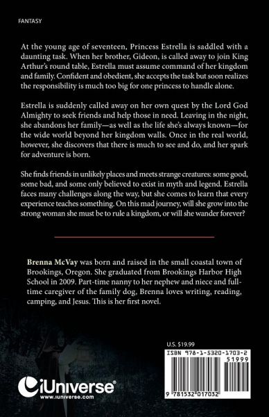 At the young age of seventeen, Princess Estrella is saddled with a daunting task. When her brother, Gideon, is called away to join King Arthur's round table, Estrella must assume command of her kingdom and family. Confident and obedient, she accepts the task but soon realizes the responsibility is much too big for one princess to handle alone. Estrella is suddenly called away on her own quest by the Lord God Almighty to seek friends and help those in need. Leaving in the night, she abandons her family-as well as the life she's always known-for the wide world beyond her kingdom walls. Once in the real world, however, she discovers that there is much to see and do, and her spark for adventure is born. She finds friends in unlikely places and meets strange creatures: some good, some bad, and some only believed to exist in myth and legend. Estrella faces many challenges along the way, but she comes to learn that every experience teaches something. On this mad journey, will she grow into the strong woman she must be to rule a kingdom, or will she wander forever?