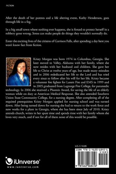 After the death of her parents and a life altering event, Kathy Henderson, goes through life in a fog. In a big small town where nothing ever happens, she is forced to protect herself in a robbery gone wrong. Stress can make people do things they wouldn't normally do. Enter the exciting lives of the citizens of Garrison Falls, after spending a day here you want know fact from fiction.