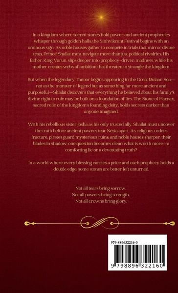In a kingdom where sacred stones hold power and ancient prophecies whisper through golden halls, the Sinhvikrant Festival begins with an ominous sign. As noble houses gather to compete in trials that mirror divine tests, Prince Shailat must navigate more than just political rivalries. His father, King Varun, slips deeper into prophecy-driven madness, while his mother creates webs of ambition that threaten to strangle the kingdom. But when the legendary Tanoor begins appearing in the Great Rulaan Sea-not as the monster of legend but as something far more ancient and purposeful-Shailat discovers that everything he believed about his family's divine right to rule may be built on a foundation of lies. The Stone of Haryax, sacred relic of the kingdom's founding deity, holds secrets darker than anyone imagined. With his rebellious sister Josha as his only trusted ally, Shailat must uncover the truth before ancient powers tear Nesia apart. As religious orders fracture, pirates guard mysterious ruins, and noble houses sharpen their blades in shadow, one question becomes clear: what is worth more-a comforting lie or a devastating truth? In a world where every blessing carries a price and each prophecy holds a double edge, some stones are better left unturned. Not all tears bring sorrow. Not all powers bring strength. Not all crowns bring glory.