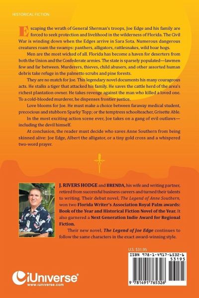 Escaping the wrath of General Sherman's troops, Joe Edge and his family are forced to seek protection and livelihood in the wilderness of Florida. The Civil War is winding down when the Edges arrive in Sara Sota. Numerous dangerous creatures roam the swamps: panthers, alligators, rattlesnakes, wild boar hogs. Men are the most wicked of all. Florida has become a haven for deserters from both the Union and the Confederate armies. The state is sparsely populated-lawmen few and far between. Murderers, thieves, child abusers, and other assorted human debris take refuge in the palmetto scrubs and pine forests. They are no match for Joe. This legendary novel documents his many courageous acts. He stalks a tiger that attacked his family. He saves the cattle herd of the area's richest plantation owner. He takes revenge against the man who killed a loved one. To a cold-blooded murderer, he dispenses frontier justice. Love blooms for Joe. He must make a choice between faraway medical student, precocious and stubborn Sparky Topp; or the temptress schoolteacher, Grisette Able. In the most exciting action scene ever, Joe takes on a gang of evil outlaws-including the devil himself. At conclusion, the reader must decide who saves Anne Southern from being skinned alive: Joe Edge, Albert the alligator, or a tiny gold cross and a whispered two-word prayer.
