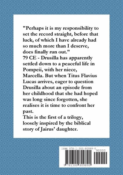 Perhaps it is my responsibility to set the record straight, before that luck, of which I have already had so much more than I deserve, does finally run out." 79 CE - Drusilla has apparently settled down to a peaceful life in Pompeii, with her niece, Marcella. But when Titus Flavius Lucas arrives, eager to question Drusilla about an episode from her childhood that she had hoped was long since forgotten, she realises it is time to confront her past. This is the first of a trilogy, loosely inspired by the biblical story of Jairus' daughter.