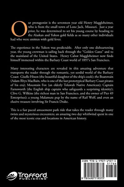 Our protagonist is the seventeen year old Henry Maggleheimer, who is from the small town of Lone Jack, Missouri. Just a year prior, he was determined to set his young course by heading to the Alaskan and Yukon gold fields along with so many others who were smitten with gold fever. The experience up north was predictable; after only one disheartening year, he has sailed with a crew back to the mainland of the United States and San Francisco. Henry Cabot Maggleheimer now finds himself immersed within the Barbary Coast world of 1897's San Francisco. Many interesting characters are revealed in this worldwind venture through the romantic, yet sordid world of the Barbary Coast: Giselle Hixon (the beautiful daughter of the ship's cook); the Boatswain (Adam Rhys MacBain, who is one of the last prototypical Barbary Coast pirates of his era); Mountain Fox (an elderly Tolawah Native American); Captain Farnsworth (the English ship captain who safeguards a surprising identity); Clive G. Wilkins (the richest man in San Francisco, and the owner of Pier 49 Enterprises); a young Malamute pup by the name of Rail Wolf, and even an elusive treasure involving Sir Francis Drake. This is a fast paced amusement park ride that takes the reader through many twists and mysterious sub plots; an amazing two days spent in one of the most iconic eras and locations in American history.