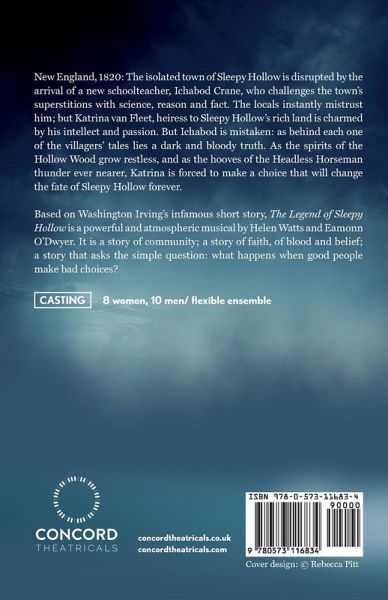 England, 1820: The isolated town of Sleepy Hollow is disrupted by the arrival of a new schoolteacher, Ichabod Crane, who challenges the town's superstitions with science, reason and fact. The locals instantly mistrust him; but Katrina van Fleet, heiress to Sleepy Hollow's rich land is charmed by his intellect and passion. But Ichabod is mistaken: as behind each one of the villagers' tales lies a dark and bloody truth. As the spirits of the Hollow Wood grow restless, and as the hooves of the Headless Horseman thunder ever nearer, Katrina is forced to make a choice that will change the fate of Sleepy Hollow forever. Based on Washington Irving's infamous short story, The Legend of Sleepy Hollow is a powerful and atmospheric musical by Helen Watts and Eamonn O'Dwyer. It is a story of community; a story of faith, of blood and belief; a story that asks the simple question: what happens when good people make bad choices?
