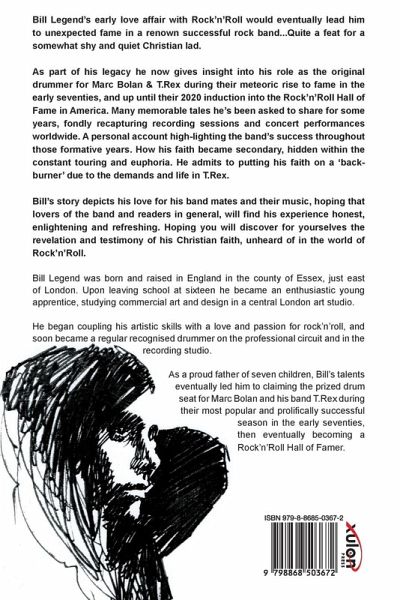 Bill Legend's early love affair with Rock'n'Roll would eventually lead him to unexpected fame in a renown successful rock band...Quite a feat for a somewhat shy and quiet Christian lad. As part of his legacy he now gives insight into his role as the original drummer for Marc Bolan & T.Rex during their meteoric rise to fame in the early seventies, and up until their 2020 induction into the Rock'n'Roll Hall of Fame in America. Many memorable tales he's been asked to share for some years, fondly recapturing recording sessions and concert performances worldwide. A personal account high-lighting the band's success throughout those formative years. How his faith became secondary, hidden within the constant touring and euphoria. He admits to putting his faith on a 'back-burner' due to the demands and life in T.Rex. Bill's story depicts his love for his band mates and their music, hoping that lovers of the band and readers in general, will find his experience honest, enlightening and refreshing. Hoping you will discover for yourselves the revelation and testimony of his Christian faith, unheard of in the world of Rock'n'Roll. Bill Legend was born and raised in England in the county of Essex, just east of London. Upon leaving school at sixteen he became an enthusiastic young apprentice, studying commercial art and design in a central London art studio. He began coupling his artistic skills with a love and passion for rock'n'roll, and soon became a regular recognised drummer on the professional circuit and in the recording studio. As a proud father of seven children, Bill's talents eventually led him to claiming the prized drum seat for Marc Bolan and his band T.Rex during their most popular and prolifically successful season in the early seventies, then eventually becoming a Rock'n'Roll Hall of Famer.