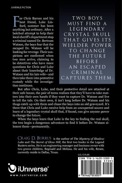 For Chris Barnes and his best friend, Luke Lin-ford, summer has been anything but ordinary. After a botched attempt to help their local sheriff's department stop a criminal named Dr. Bertram Watson, the boys fear that the escaped Dr. Watson will be looking for revenge. Their suspicions are confirmed when two men arrive, claiming to be detectives who have more questions for Chris and Luke about their knowledge of Dr. Watson and his late wife-and then take them into protective custody while the investigation continues. But after Chris, Luke, and their protective detail are attacked at their safe house, the pair of teens realizes that they'll have to take matters into their own hands if they want to capture Dr. Watson and live to tell the tale. On their own, it isn't long before Dr. Watson and his thugs catch up with them and chase the boys into an old graveyard. It's there that Chris and Luke receive help from an unexpected source and learn of a legendary crystal skull that, if found, can give anyone power to change the future. When the boys learn that Luke is the key to finding the real skull, the two begin a dangerous adventure to find it before Dr. Watson silences them-permanently.