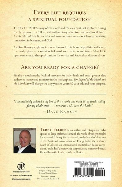 Every life requires a spiritual foundation. "Grandfather, you left this..." Julio lifted the leather-bound journal and stepped toward the old man. "It is yours now," said Antonio, with a gleam in his eye. "I've lived my life according to the twelve principles recorded in it. And if you will apply its principles as I did, your success will be greater than you could ever imagine." Be a minister in the marketplace. Terry Felber has written a parable that will transform your life and your business. Many years ago, this ago book helped Dave Ramsey rediscover the marketplace as a mission field--and merchants as ministers. Now let it open your eyes to the opportunities for service and leadership all around you. Are you ready for a change? The Legend of the Monk and the Merchant will change the way you see yourself, your job, and your purpose. Now includes personal and small group study guide.