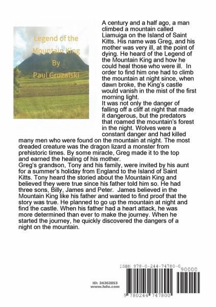Hundred and fifty years Tony's grandfather climbed Mt. Laimugia which is on St Kitts Island at night. Here he saw the Mountain King whose legend says that he can be found there but vanishes with the first rays of the morning son. If one climbs the mountain at night and sees him he will grant your wish for a healing of a love one. Greg asked for the healing of his mother and his wish was granted. James, Tony's son, is desperate to see him to prove the story is correct and heal his father after a serious heart attack. Facing all the dangers of the night climb he sets out to find the King but the dangers that await him are formidable.