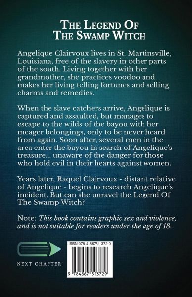 This book contains graphic sex and violence, and is not suitable for readers under the age of 18. Angelique Clairvoux lives in St. Martinsville, Louisiana, free of the slavery in other parts of the south. Living together with her grandmother, she practices voodoo and makes her living telling fortunes and selling charms and remedies. When the slave catchers arrive, Angelique is captured and assaulted, but manages to escape to the wilds of the bayou with her meager belongings, only to be never heard from again. Soon after, several men in the area enter the bayou in search of Angelique's treasure... unaware of the danger for those who hold evil in their hearts against women. Years later, Raquel Clairvoux - distant relative of Angelique - begins to research Angelique's incident. But can she unravel the Legend Of The Swamp Witch?